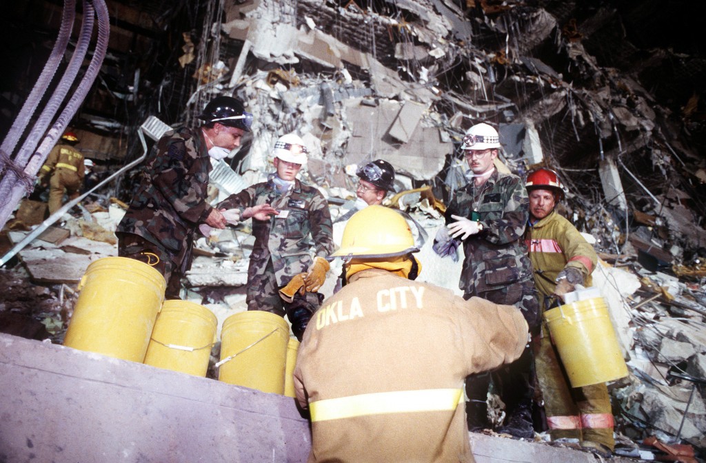 U.S. Air Force personnel from Tinker Air Force Base work alongside civilian firefighters to remove rubble from the explosion site of the Federal Building in Oklahoma City. The U.S. Air Force is providing around-the-clock support of personnel, equipment, and supplies during rescue and relief efforts.